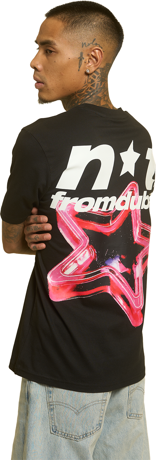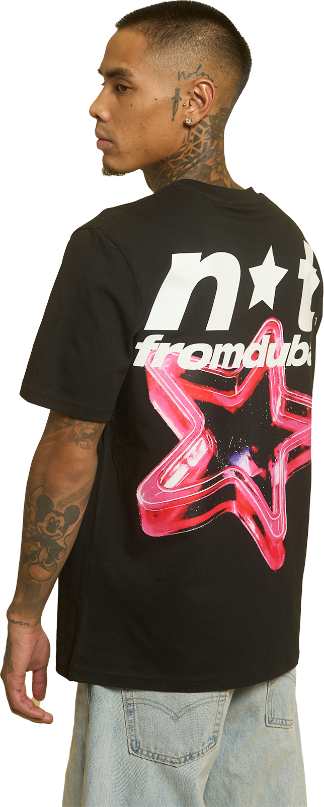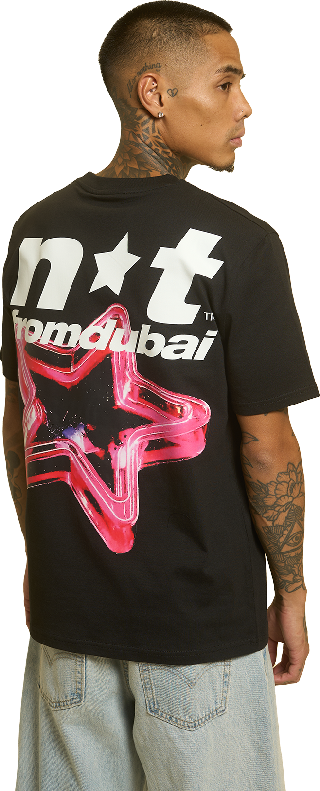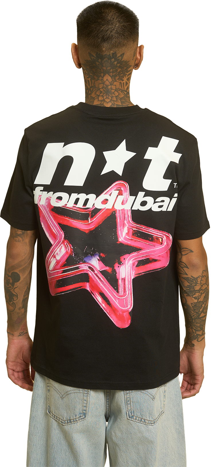 Camiseta de manga corta en color negro. Corte ligeramente oversize en algodón de peso medio. Cuello redondo de 3cm. Logotipo gráfico de NOTFROMDUBAI.
