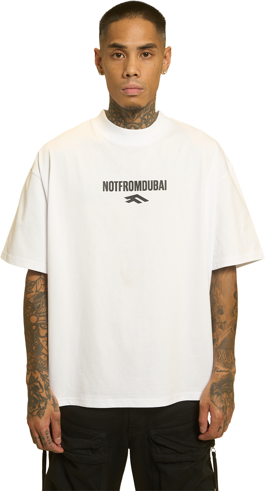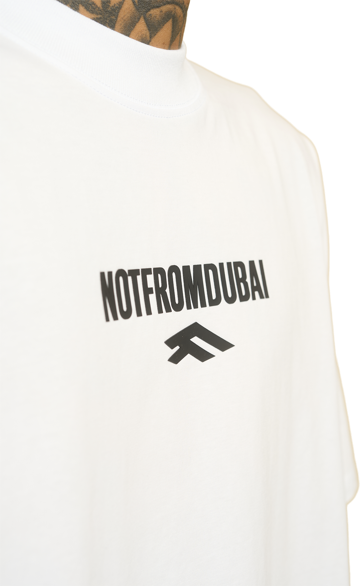 Camiseta de manga corta en color blanco. Corte ligeramente oversize en algodón de peso medio. Cuello redondo de 3cm. Logotipo gráfico de NOTFROMDUBAI.